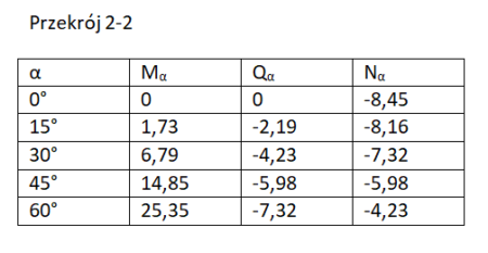 Łuk przegubowy swobodnie podparty – przekrój 2-2 tabela