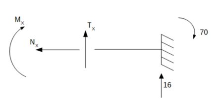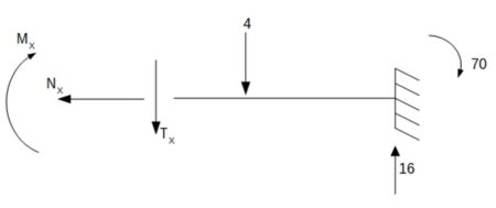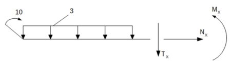 \end{array}Siły wewnętrzne zostały obliczone na długości całej belki. Nas interesują siły w zaznaczonym przekroju α-α, czyli w miejscu utwierdzenia belki, z obliczeń odczytujemy siły wewnętrzne działające w tym miejscu i przedstawiają się one następująco.