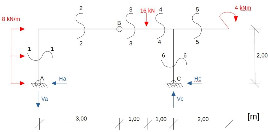 Projekt ramy statycznie wyznaczalnej, w której zostały obliczone reakcje podporowe oraz siły wewnętrzne w poszczególnych prętach. Podpierają ją dwie podpory przegubowe i rozdziela ją na dwie części przegub w punkcie B. Obciążona jest trzema różnymi rodzajami sił zewnętrznych. Wszystko widać na schemacie. Zapraszam do zapoznania się z poniższym przykładem.