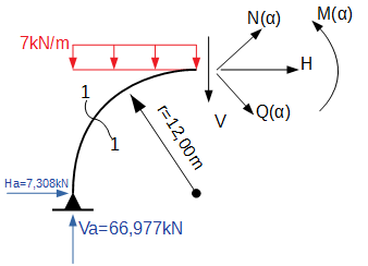 Przed rozpoczęciem obliczeń, należy zauważyć, że siły wewnętrzne (tnące i normalne) powstające po przecięciu pręta, które są równoległe i prostopadłe do osi pręta, będą zmieniały swoje położenie wraz z krzywoliniową linią łuku. Momentu zginającego to nie dotyczy, ponieważ on się obraca.