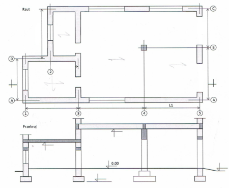 Schemat hali żelbetowej – rzut i przekrój